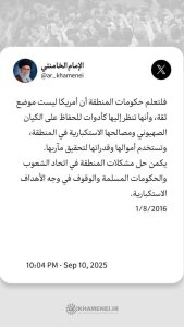 وقال الخامنئي في تصريح مؤرخ بتاريخ (1 آب 2016) أعاد نشره مكتبه الرسمي على منصة “إكس” مساء الثلاثاء (10 أيلول 2025)، إن “أمريكا تستغل أموال وقدرات دول المنطقة لتحقيق مآربها”، مشدداً على أن “الحل الحقيقي لمشكلات المنطقة يكمن في اتحاد الشعوب والحكومات المسلمة والوقوف صفاً واحداً بوجه المخططات الاستكبارية”.