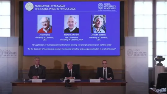 أعلنت الأكاديمية الملكية السويدية للعلوم منح جائزة نوبل في الفيزياء لكل من البريطاني جون كلارك، والفرنسي ميشيل هـ. ديفوريت، والأميركي جون م. مارتينيس لما حققوه من اكتشافات فيما يتعلق “بالنفق الميكانيكي الكمي العيني وتكميم الطاقة في الدائرة الكهربائية”.