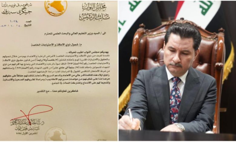 وذكر بيان لمكتبه انه” استجابةً لمناشدة لفيفٍ من ذوي الإعاقة والاحتياجات الخاصة، وجّه نائب رئيس مجلس النواب، شاخوان عبدالله، خطابًا رسميًا إلى وزير التعليم العالي والبحث العلمي ، دعا فيه إلى الاهتمام بهذه الشريحة المهمة من المجتمع، وشمولهم بالحقوق والامتيازات التي كفلها لهم قانون ذوي الإعاقة والاحتياجات الخاصة رقم (38) لسنة 2013″.