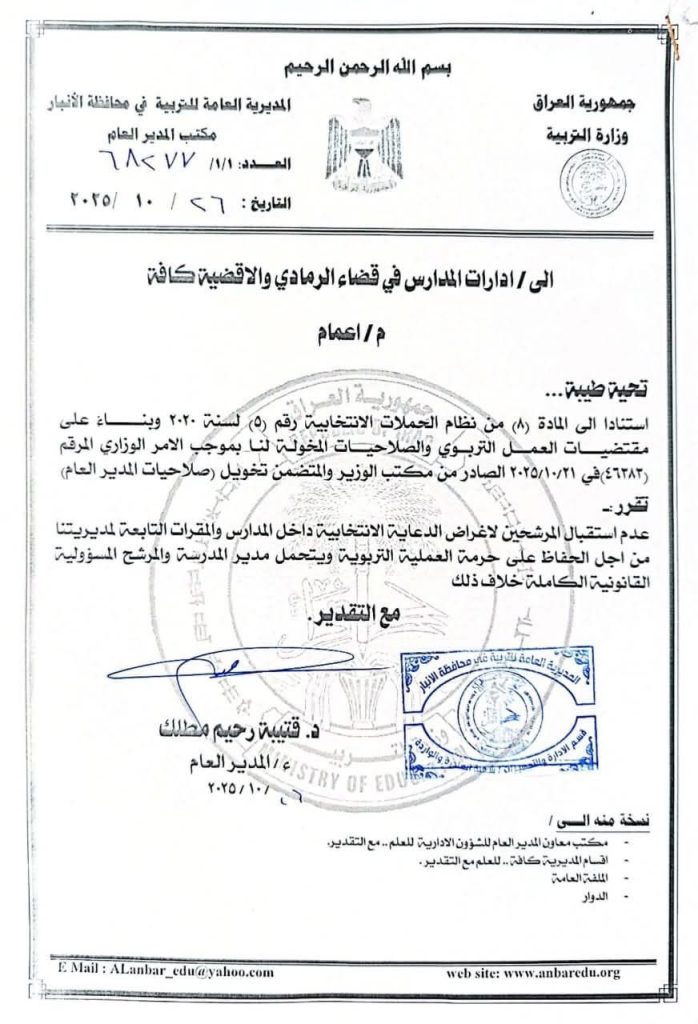 منعت المديرية العامة للتربية في محافظة الأنبار، استقبال المرشحين للانتخابات البرلمانية في المدارس والمقرات التابعة للمديرية، بحسب وثيقة ادناه نصها:
