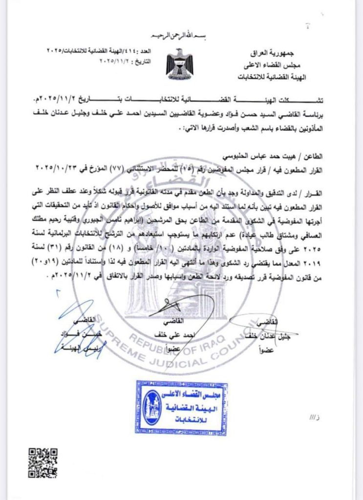 وبحسب وثيقة صادرة عن المجلس فان القضاء العراقي رد الدعوى الثانية ضد النامس، مؤكداً سلامة موقف الوزير ومتانة الأسس القانونية التي يستند إليها.