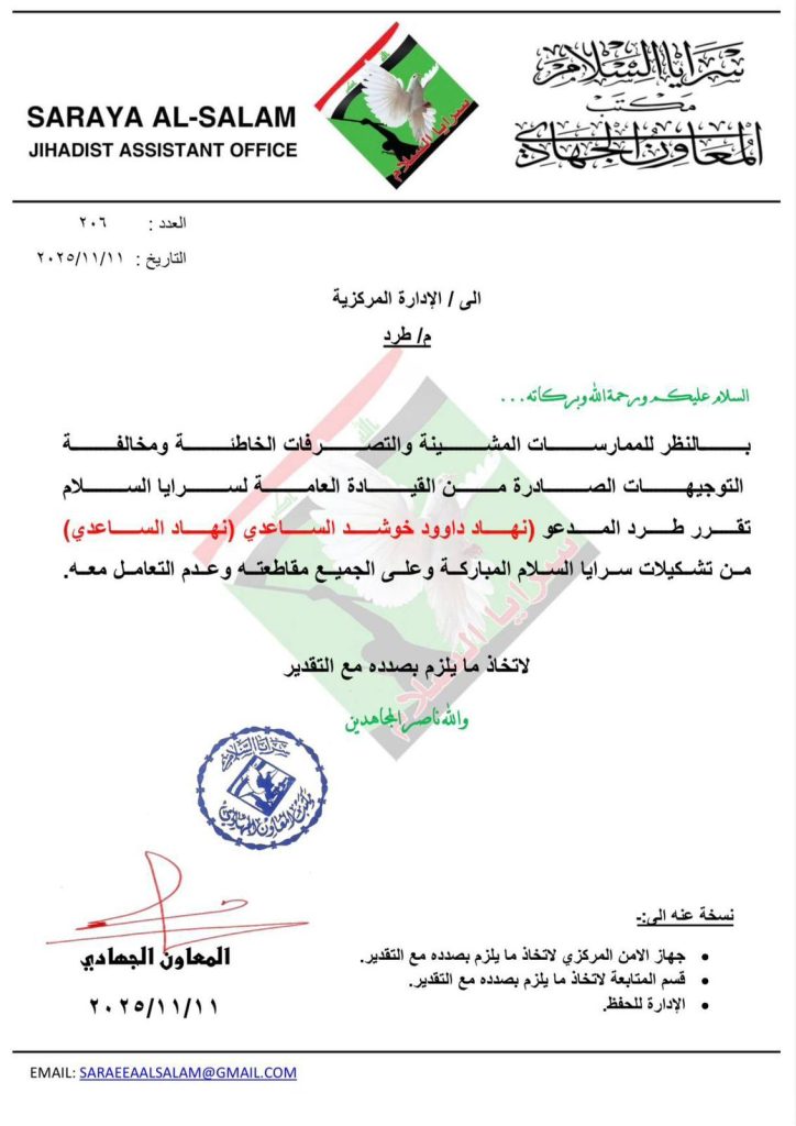 وقالت السرايا في كتاب رسمي، “بالنظر للممارسات المشينة والتصرفات الخاطئة ومخالفة التوجيهات الصادرة من القيادة العامة لسرايا السلام، تقرر طرد المدعو نهاد داوود خوشد الساعدي من تشكيلات سرايا السلام”.