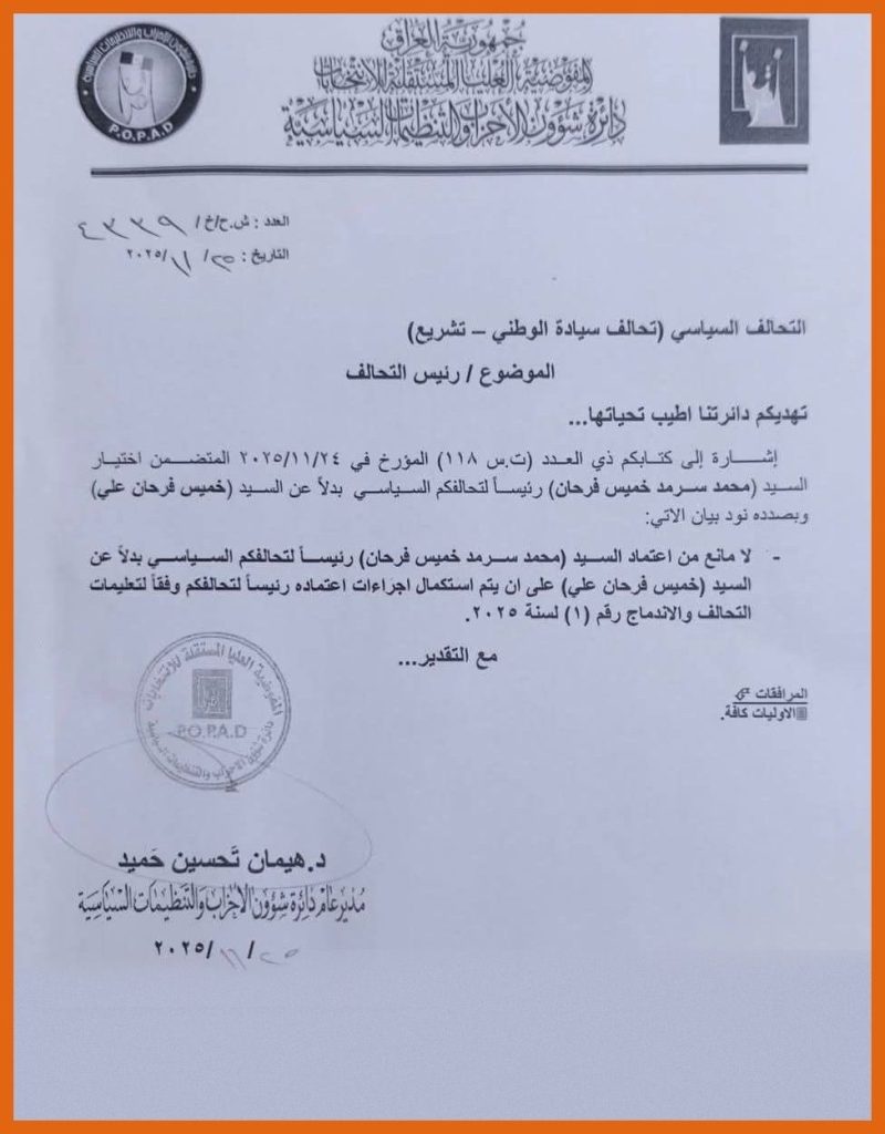 وجاء في وثيقة صادرة عن المفوضية، اليوم الثلاثاء (25 تشرين الثاني 2025)، “عدم وجود أي مانع من اعتماد محمد سرمد خميس فرحان رئيساً لتحالف سيادة الوطني، بدلاً عن خميس فرحان علي، وذلك استناداً إلى الطلب المقدم بتاريخ 24/11/2025 والمتعلق بتغيير رئاسة التحالف”.
