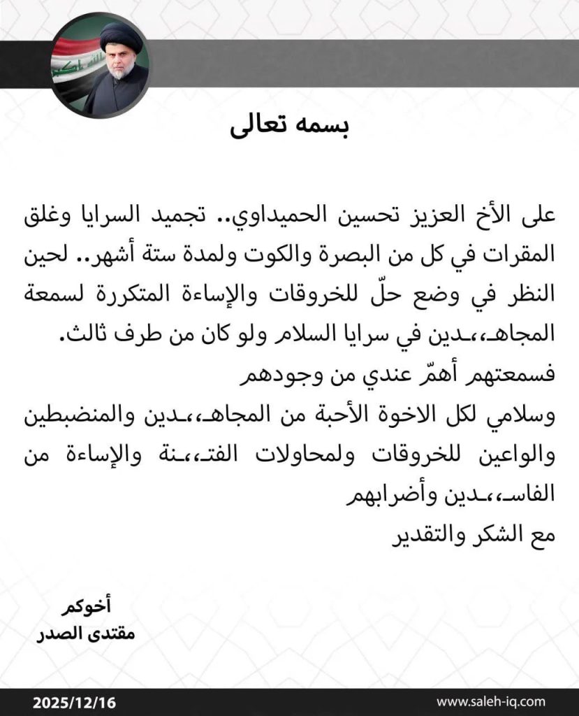 أخبارسياسة الصدر يوجه بتجميد نشاط السرايا في البصرة وواسط لنصف عام قرر زعيم التيار الوطني الشيعي، مقتدى الصدر، تجميد سرايا السلام وغلق مقارها في البصرة والكوت لـ6 أشهر فيسبوك X ماسنجر ماسنجر واتساب تيلقرام
