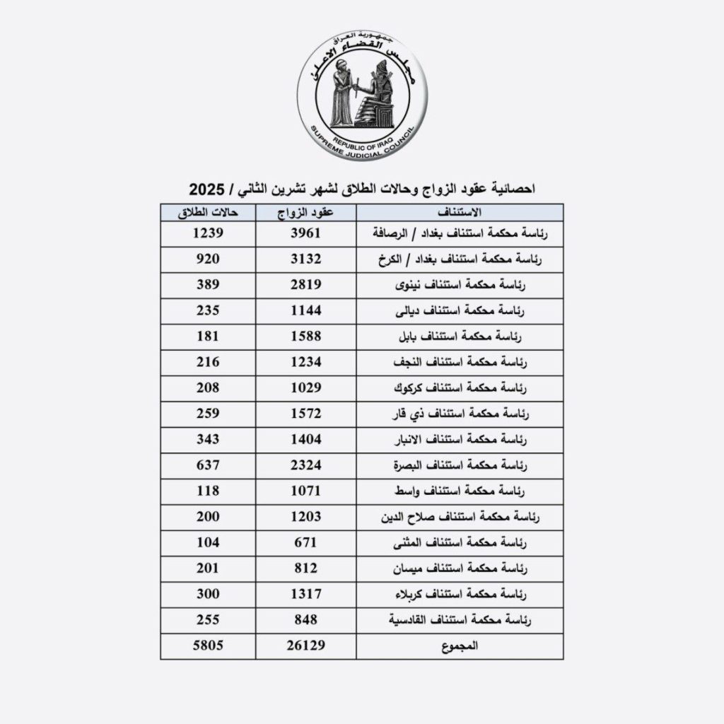 وكشف مجلس القضاء الأعلى، اليوم الأربعاء 17 كانون الأول 2025، عن إحصائية عدد حالات الزواج والطلاق لشهر تشرين الثاني 2025، مبيناً أن “مجموع عقود الزواج لشهر تشرين الثاني الماضي بلغ 26129، في حين بلغت حالات الطلاق 5805حالات”.