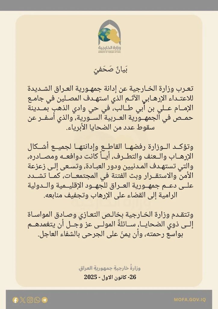 أخبارأمنسياسة الخارجية العراقية تستنكر استهداف المصلين في أحد جوامع حمص أعربت وزارة الخارجية العراقية، اليوم الجمعة، عن إدانتها للاعتداء الإرهابي في جامع الإمام علي (ع) في مدينة حمص السورية. فيسبوك X ماسنجر ماسنجر واتساب تيلقرام