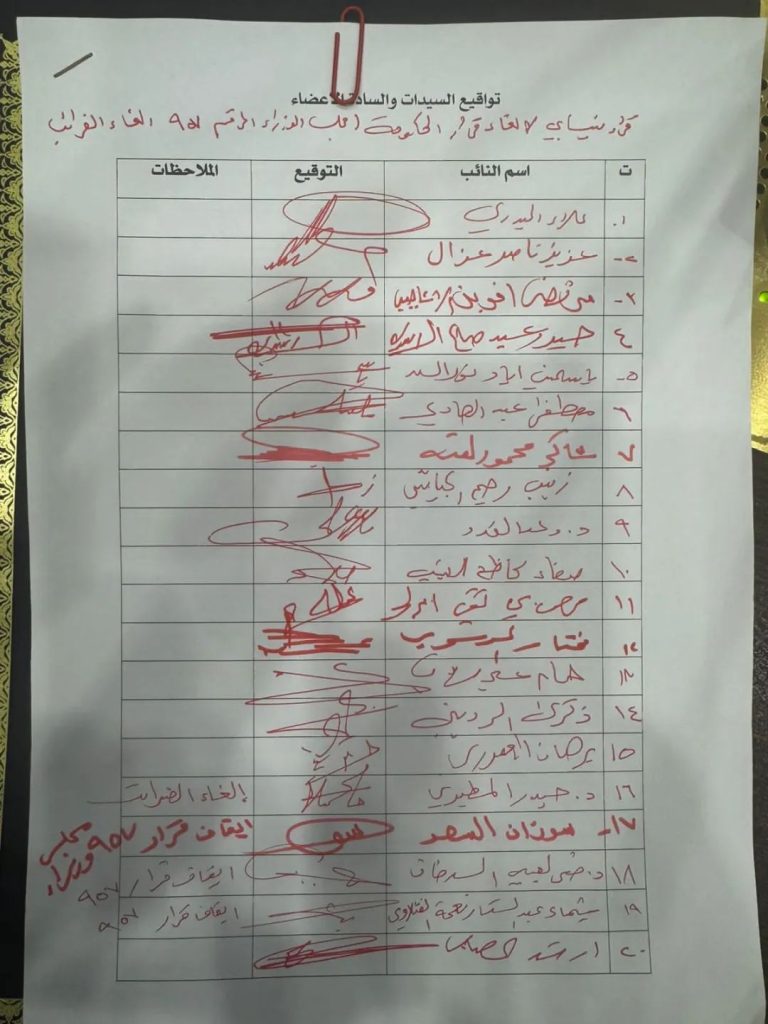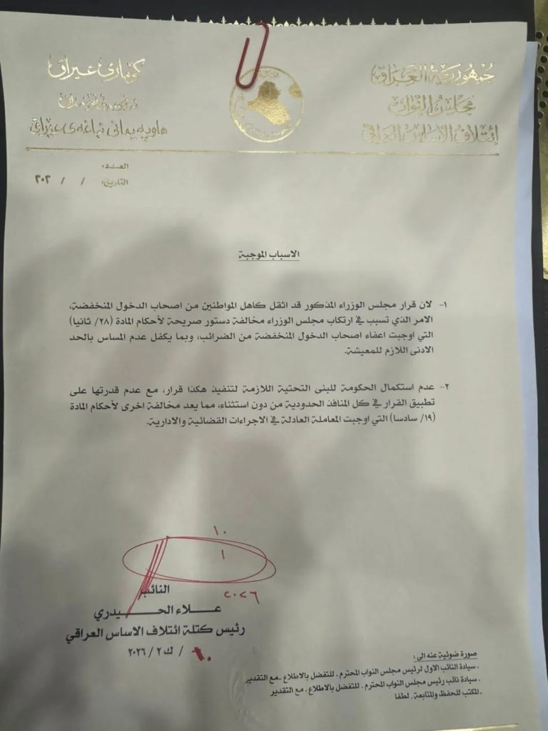 باشر عدد من أعضاء مجلس النواب العراقي، يوم السبت، بجمع تواقيع نيابية بهدف إلغاء قرار صادر عن مجلس الوزراء للحكومة المنتهية ولايتها، يتعلق بفرض إجراءات ضريبية، مؤكدين مخالفته أحكام الدستور والقوانين النافذة.