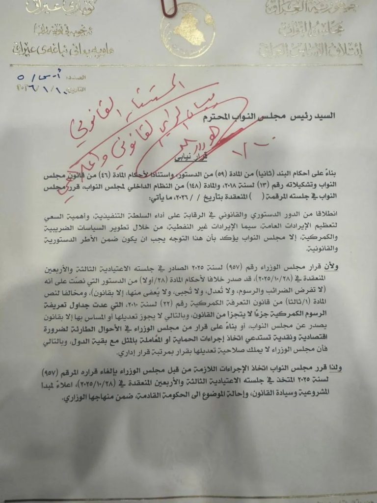 وبحسب وثيقة تنشرها أدناه فنار نيوز ،فإن قرار مجلس الوزراء رقم (97) لسنة 2025، الصادر في الجلسة الاعتيادية الثالثة والأربعين المنعقدة بتاريخ 28/10/2025، صدر خلافاً لأحكام المادة (28/أولاً) من الدستور التي تنص على عدم فرض الضرائب أو الرسوم أو تعديلها أو جبايتها إلا بقانون، فضلاً عن مخالفته لأحكام المادة (1/ثالثاً) من قانون التعرفة الجمركية رقم (22) لسنة 2010 المعدل، والتي أكدت أن الرسوم الجمركية جزء لا يتجزأ من القانون ولا يجوز تعديلها أو المساس بها إلا بقانون يصدر عن مجلس النواب، أو بقرار من مجلس الوزراء في حالات الضرورة الاقتصادية وبما يقتضيه اتخاذ إجراءات الحماية المؤقتة.