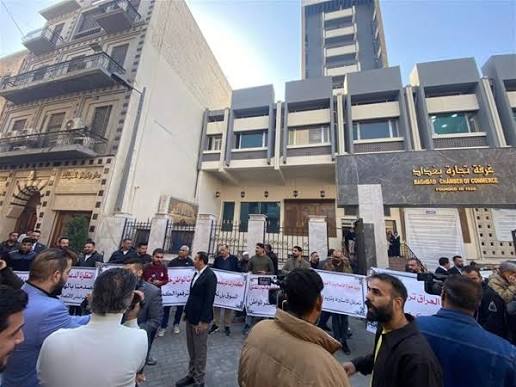 تظاهر العشرات من التجار، يوم الاحد، امام غرفة تجارة بغداد احتجاجا على قرار فرض ضرائب ورسوم جديدة وتطبيق التعرفة الجمركية على البضائع المستوردة.