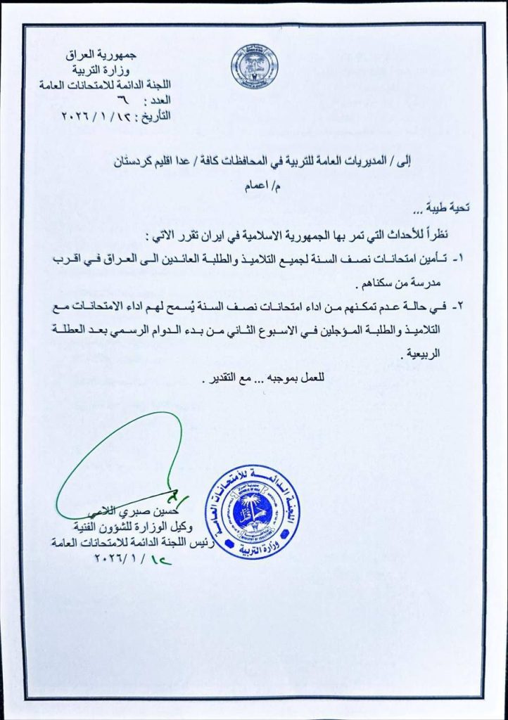 وذكر بيان للوزارة، أنه “نظراً للأحداث الجارية في إيران، أصدرت وزارة التربية/ اللجنة الدائمة للامتحانات العامة، توجيهاً عاجلاً يقضي بتأمين أداء امتحانات نصف السنة لجميع التلاميذ والطلبة العائدين إلى العراق من إيران، وذلك في أقرب مدرسة إلى محل سكنهم”.