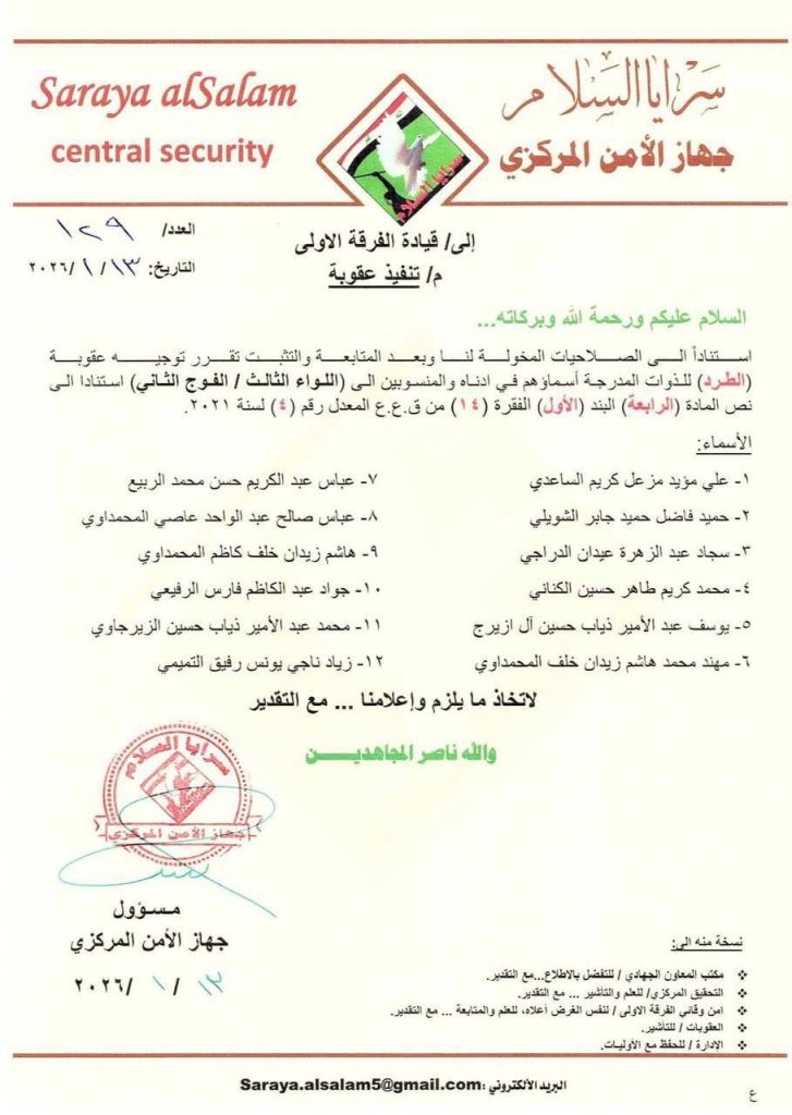 وجه زعيم التيار الوطني الشيعي السيد مقتدى الصدر، اليوم الأربعاء، بطرد 12 عنصرا من سرايا السلام على خلفية الاشتباكات المسلحة مع القوات الأمنية في منطقة الشعب شمالي العاصمة بغداد.