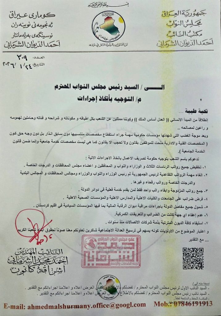 وجّه عضو مجلس النواب أحمد مجيد الشرماني، اليوم السبت، كتاباً رسمياً إلى رئيس المجلس دعا فيه إلى توجيه الحكومة لاتخاذ إجراءات مالية وإدارية، في مقدمتها إلغاء الرواتب التقاعدية لرئيس الجمهورية ورئيس الوزراء والنواب والوزراء ورؤساء مجالس المحافظات والمجالس البلدية وأصحاب الدرجات الخاصة وغيرهم من المسؤولين.