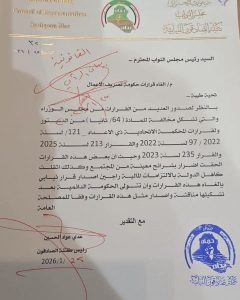 النائب عدي عواد التميمي، رئيس كتلة الصادقون، يحصل على موافقة رئيس مجلس النواب بعد جمع تواقيع نواب لإلغاء قرارات حكومة تصريف الأعمال.