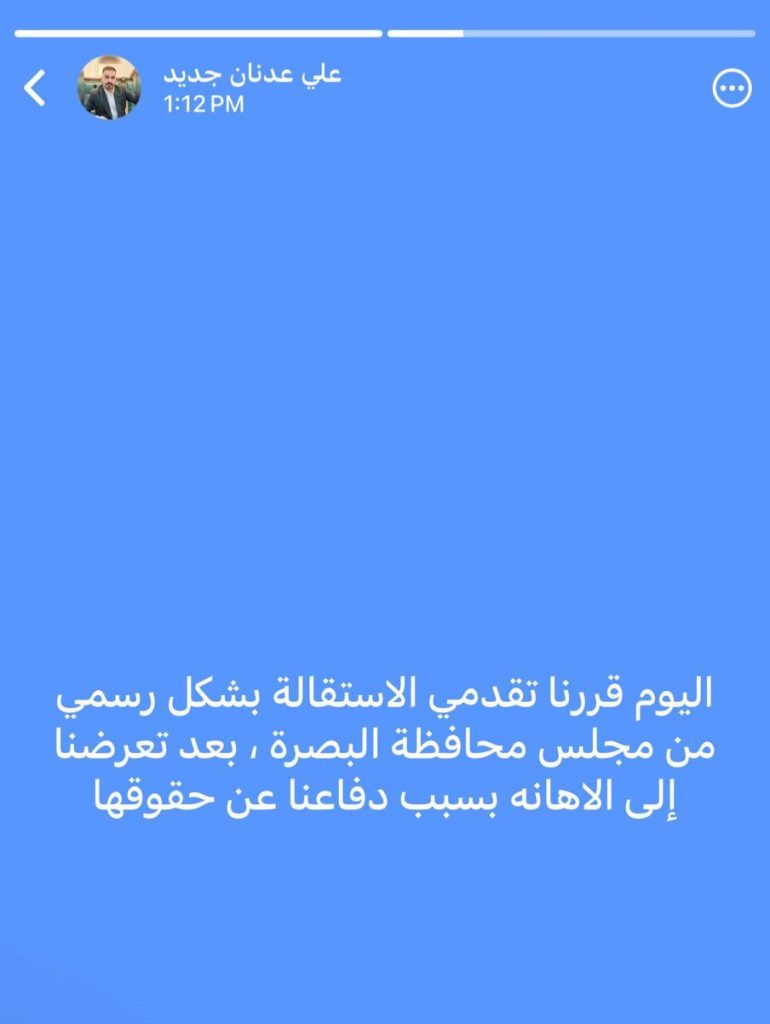 أخبارسياسة احتجاجاً على “الإساءة”.. استقالة مفاجئة لعضو مجلس محافظة البصرة علي عدنان “بعد تعرضنا للإهانة” .. علي عدنان يقدم استقالته من عضوية مجلس محافظة البصرة فيسبوك X ماسنجر ماسنجر واتساب تيلقرام