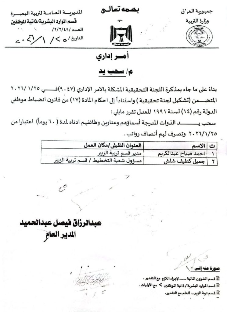 مدير عام تربية البصرة يوجه بسحب يد مدير قسم تربية الزبير ومسؤول شعبة التخطيط لمدة ٦٠ يوما بعد مذكرة اللجنة التحقيقية وتصرف لهم أنصاف رواتب وحسب الوثيقة ادناه: