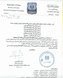 وبحسب الوثيقة فان هذا التوجيه يعتبر بمثابة مساعدة للتاجر العراقي والمستورد وكذلك لمعالجة تكدس البضائع والحاويات في ارصفة الموانئ الجنوبية.