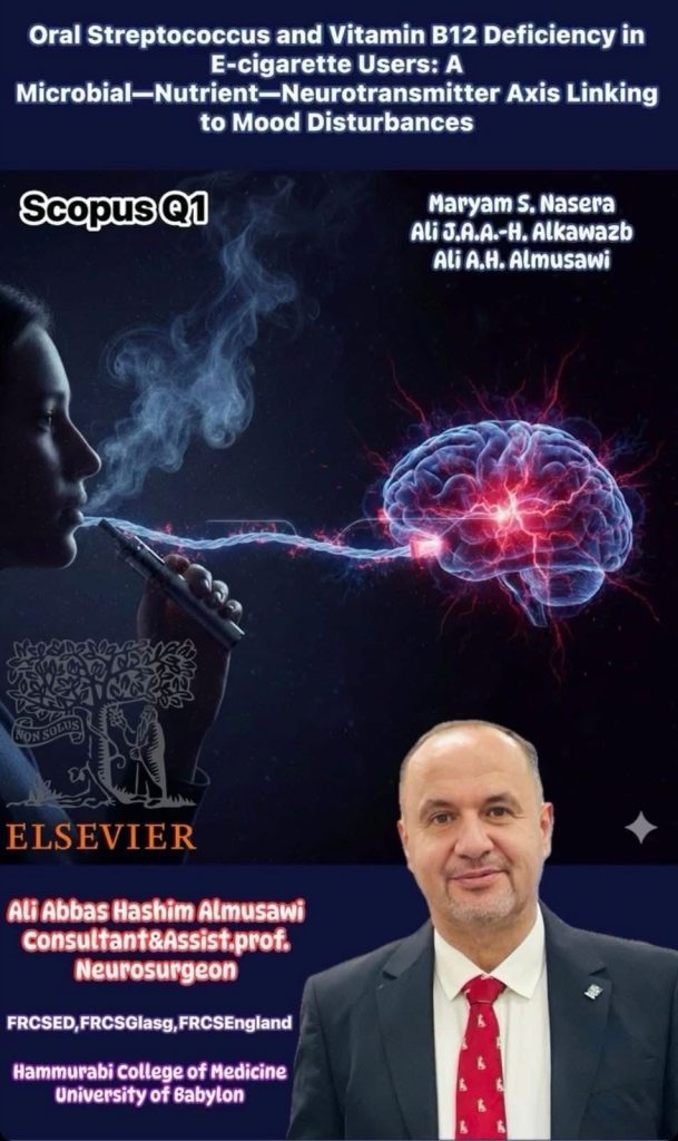 وقال الموسوي ” أن الدراسة التي تم نشرها في مجلة (The Karbala International Journal of Modern Science)، تناولت قضية صحية معاصرة تحت عنوان “بكتيريا الفم العقدية ونقص فيتامين B12 لدى مستخدمي السجائر الإلكترونية: محور (ميكروبي-غذائي-عصبي) يرتبط باضطراب المزاج”.