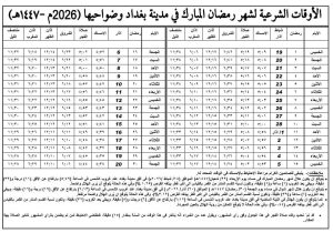 أصدر مكتب المرجع الأعلى علي السيستاني، إمساكية شهر رمضان لجميع محافظات العراق.