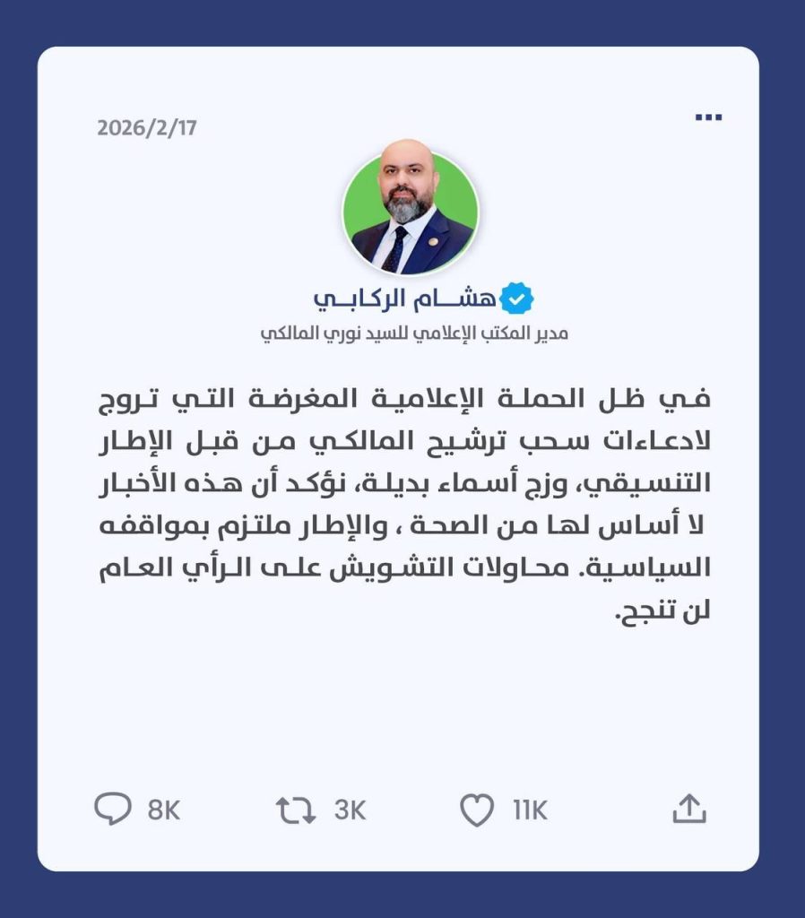 وقال مدير المكتب الإعلامي لرئيس ائتلاف دولة القانون، هشام الركابي في تدوينة على منصة (إكس)، إنه “في ظل الحملة الإعلامية المغرضة التي تروج لادعاءات سحب ترشيح المالكي من قبل الإطار التنسيقي وزج أسماء بديلة، نؤكد أن هذه الأخبار لا أساس لها من الصحة”.