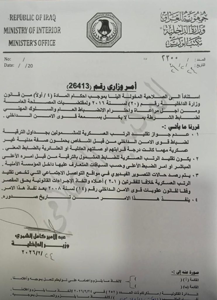 أصدر وزير الداخلية، عبد الأمير الشمري، أمراً وزارياً حازماً، يهدف إلى ضبط الممارسات المرافقة لترقية ضباط قوى الأمن الداخلي والحفاظ على هيبة الرتبة العسكرية من المظاهر غير المهنية.