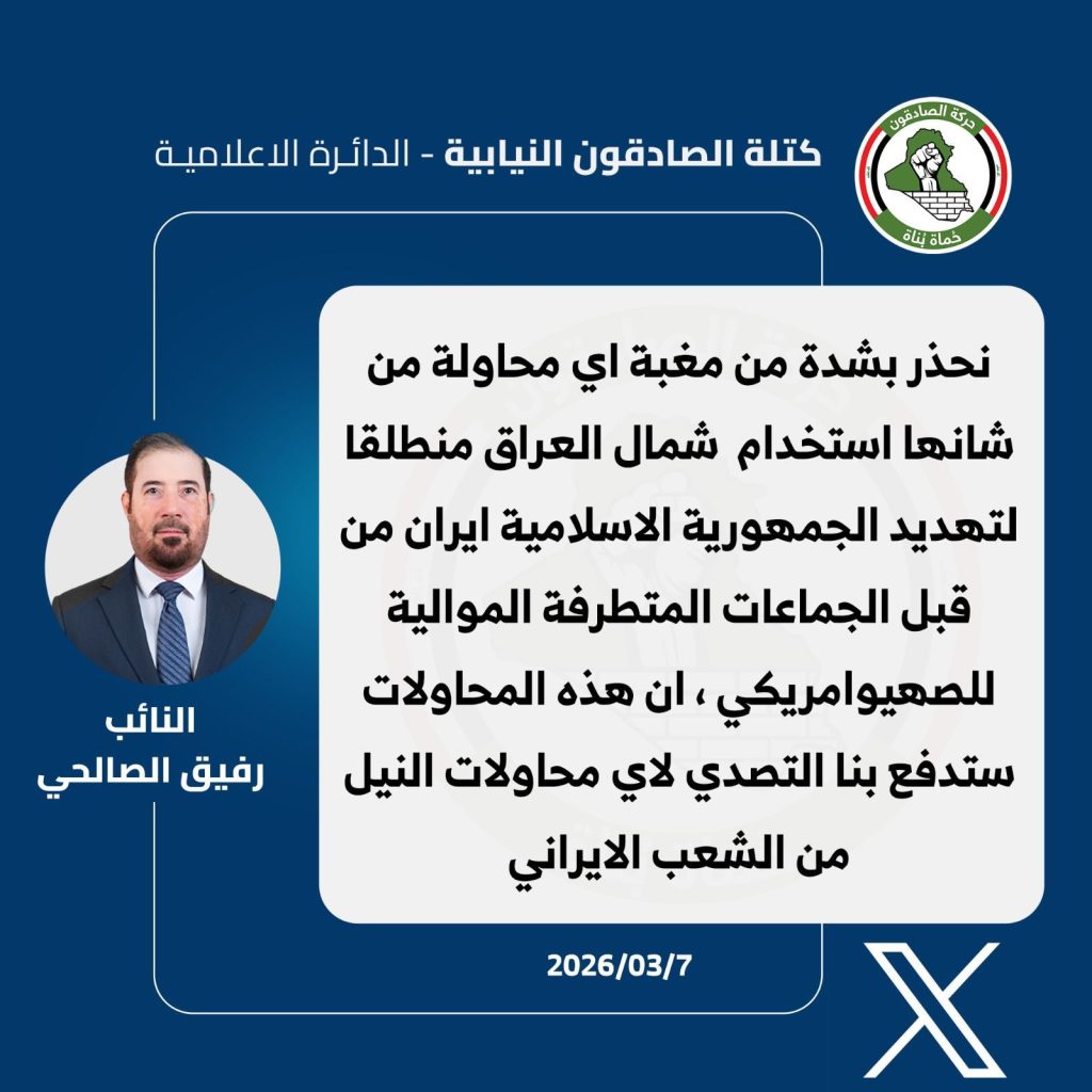 سياسة الصالحي: نحذر من محاولة استخدام شمال العراق لتهديد إيران فيسبوك X ماسنجر ماسنجر واتساب تيلقرام