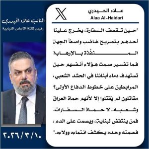 النائب علاء الحيدري: حين تقصف السفارة يخرج علينا أحدهم بتصريح غاضب واصفا المنفذ بالإرهاب، فما تفسيرهم حين تستهدف دماء أبناء الحشد