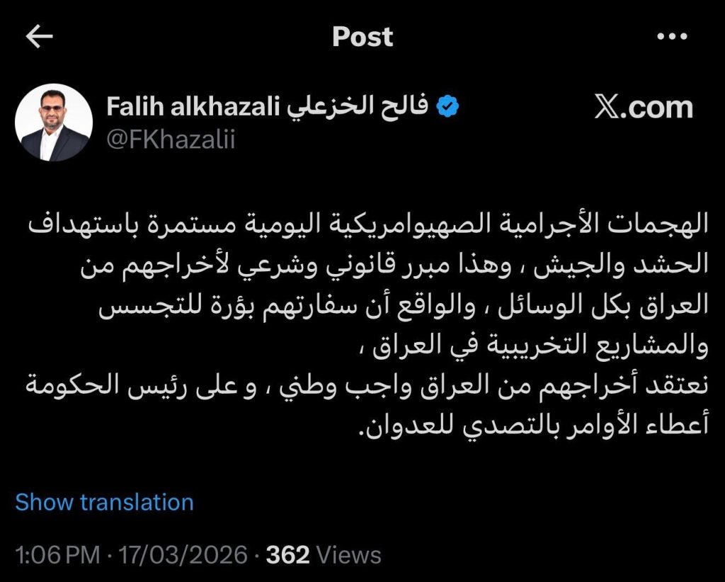 أخبارسياسة فالح الخزعلي: السفارة الأمريكية بؤرة تجسس وإخراجهم واجب وطني وعلى رئيس الحكومة التصدي فالح الخزعلي: السفارة الأمريكية بؤرة تجسس وإخراجهم واجب وطني وعلى رئيس الحكومة التصدي فيسبوك X ماسنجر ماسنجر واتساب تيلقرام