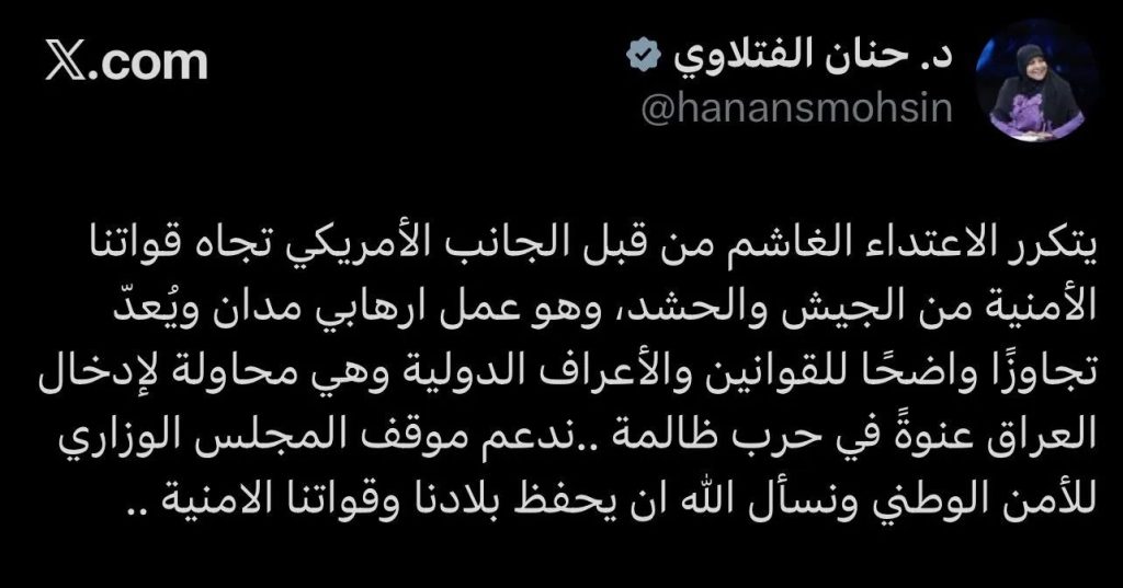 وقالت الفتلاوي في تدوينة على منصة (إكس): “يتكرر الاعتداء الغاشم من قبل الجانب الأمريكي تجاه قواتنا الأمنية من الجيش والحشد، وهو عمل إرهابي مدان ويُعدّ تجاوزًا واضحًا للقوانين والأعراف الدولية وهي محاولة لإدخال العراق عنوةً في حرب ظالمة”.