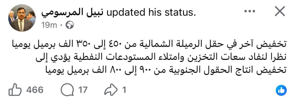 اقتصادسياسة المرسومي: تخفيض اخر في حقل الرميلة الشمالية من 450 إلى 350 ألف برميل في اليوم فيسبوك X ماسنجر ماسنجر واتساب تيلقرام