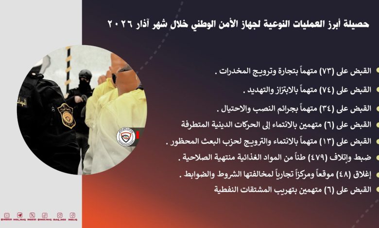 وذكر الجهاز في بيان أن “حصيلة أبرز العمليات النوعية لجهاز الأمن الوطني خلال شهر آذار 2026 بلغت (17) متهماً بالإرهاب، و(73) تاجراً ومروّجاً للمخدرات، و(74) متهماً بالابتزاز والتهديد”.