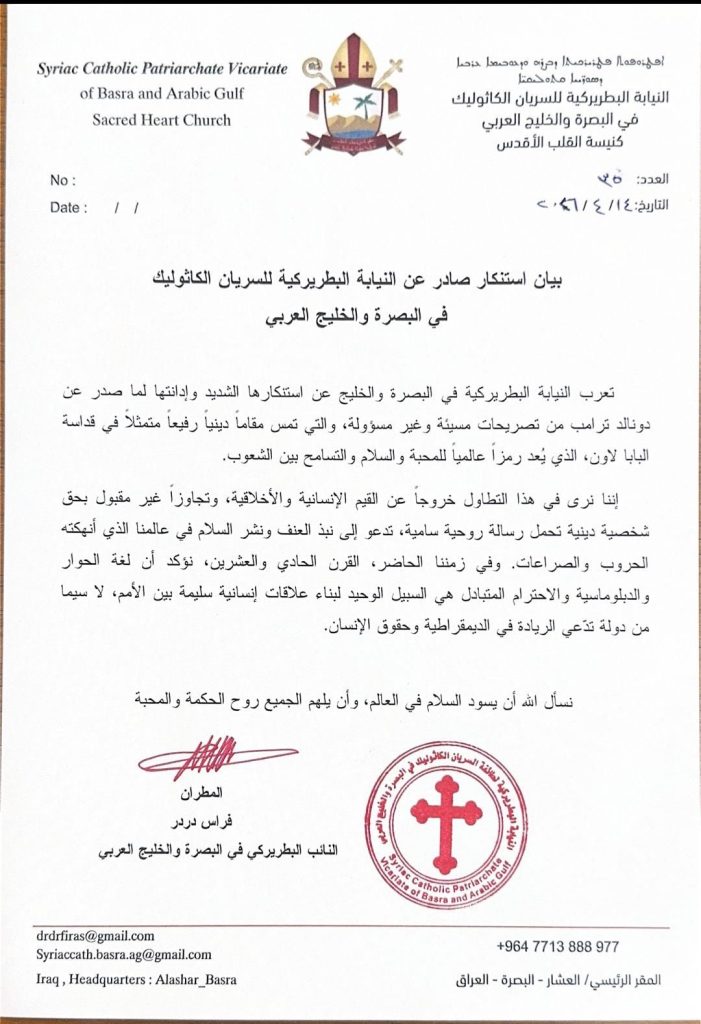 سياسة السريان الكاثوليك في البصرة والخليج العربي يستنكرون تصريحات الرئيس الامريكي ضد “البابا لاون” فيسبوك X ماسنجر ماسنجر واتساب تيلقرام